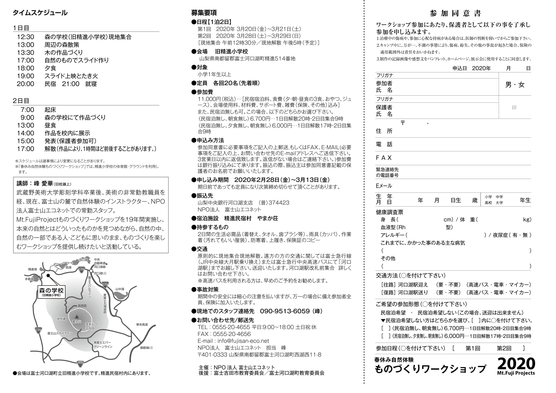 春休み自然体験ものづくりワークショップは、富士河口湖町旧精進小学校で開催します。本年度は、校舎の利用はありません。体育館とグラウンドのみ、利用します。
